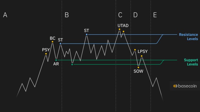 Ένας επιτυχημένος αναλυτής του Wyckoff πρέπει να είναι σε θέση να προβλέψει και να κρίνει σωστά την κατεύθυνση και το μέγεθος της μετακίνησης από ένα TR. Ευτυχώς, ο Wyckoff προσφέρει δοκιμασμένες χρονικές οδηγίες για τον προσδιορισμό και τον καθορισμό των φάσεων και συμβάντων σε ένα TR, το οποίο, με τη σειρά του, παρέχει τη βάση για την εκτίμηση των στόχων τιμών στην επόμενη τάση. Αυτές οι έννοιες απεικονίζονται σε τέσσερα σχήματα. Δύο που απεικονίζουν κοινές παραλλαγές συσσώρευσης TR, ακολουθούμενες από δύο παραδείγματα διανομής TR. Όταν ένας trader παρατηρήσει και επιβεβαιώσει ότι ένα περιουσιακό στοιχείο ή ένα κρυπτονόμισμα βρίσκεται σε Wyckoff Distribution( Διανομή) μπορεί να συμπεράνει ότι η ανοδική πορεία την τιμής έχει σταματήσει και θα ακολουθήσει πτώση.